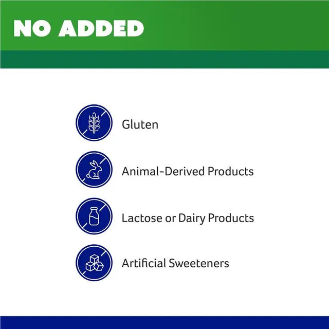 No added gluten, lactose, artificial sweeteners, dairy products or animal-derived products.