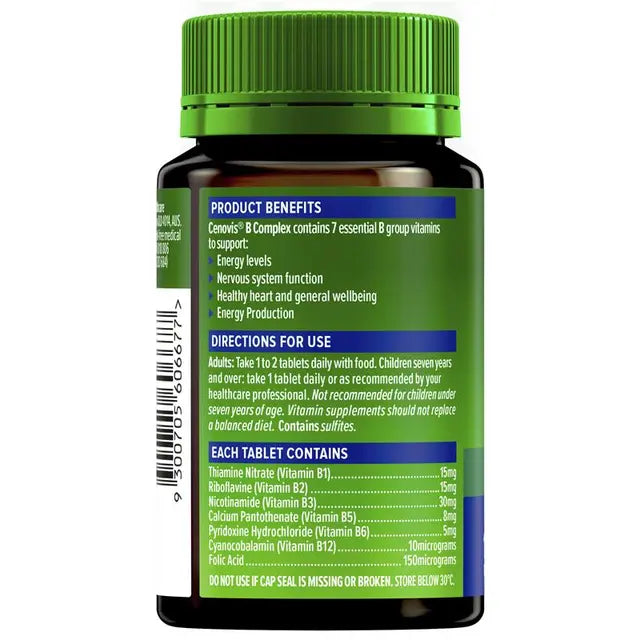Cenovis® B Complex combines seven key B vitamins, including Vitamin B1, B2, B3, B5, B6, B12 and B9 – in the form of Folic Acid, to support your energy levels. This formula maintains nervous system function and heart health while supporting your overall general wellbeing.